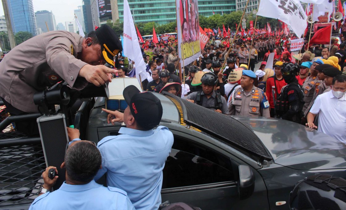 Serikat dan aliansi buruh dari berbagai sektor pekerjaan melakukan aksi unjuk rasa dalam memperingati Hari Buruh Internasional 2024 dengan mengepung…